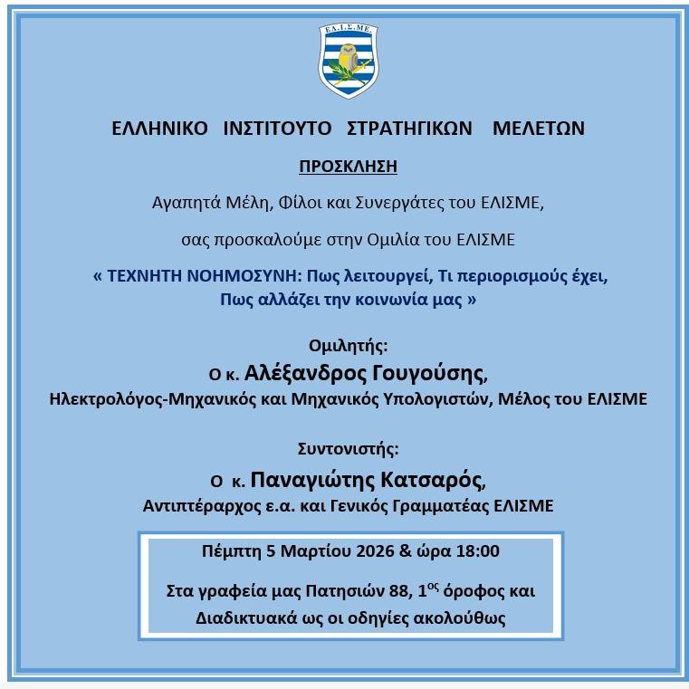 Τα άρθρα και τα σχόλια που δημοσιεύονται στην ιστοσελίδα μας εκφράζουν απαραίτητα τους συγγραφείς. Το ΕΛΙΣΜΕ δεν λογοκρίνει τις γνώμες κανενόςΕΛΛΗΝΙΚΟ ΙΝΣΤΙΤΟΥΤΟ ΣΤΡΑΤΗΓΙΚΩΝ ΜΕΛΕΤΩΝ
