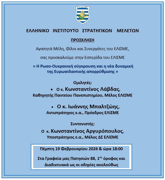 Εσπερίδα ΕΛΙΣΜΕ με θέμα « Η Ρωσο-ουκρανική σύγκρουση και η νέα δυναμική της Ευρωατλαντικής απορρύθμισης » της Πέμπτης 19 Φεβρουαρίου 2026