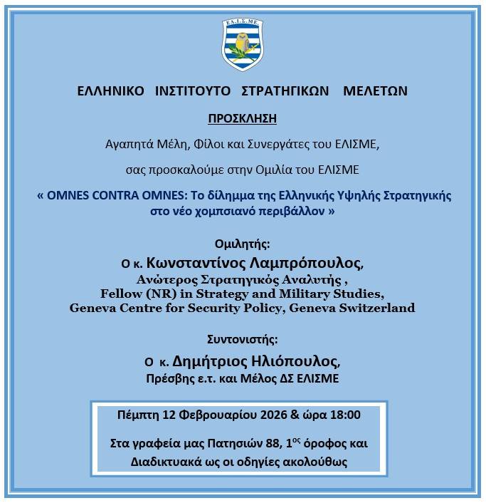 Ομιλία ΕΛΙΣΜΕ με θέμα « BELLUM OMNIUM CONTRA OMNES: Το δίλημμα της Ελληνικής Υψηλής Στρατηγικής στο νέο χομπσιανό περιβάλλον » της Πέμπτης 12 Φεβρουαρίου 2026