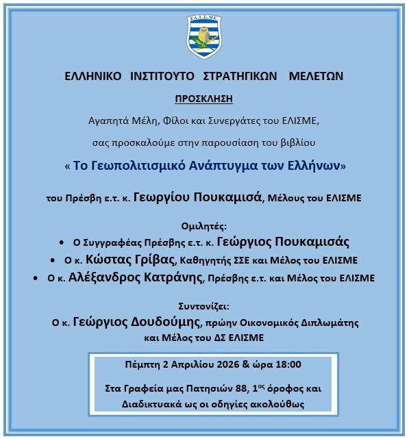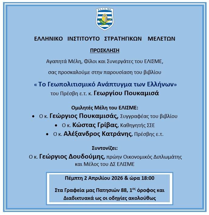Παρουσίαση του βιβλίου με θέμα " Το Γεωπολιτισμικό Ανάπτυγμα των Ελλήνων " του Πρέσβη ε.τ. κ. Γεωργίου Πουκαμισά, Μέλους του ΕΛΙΣΜΕ