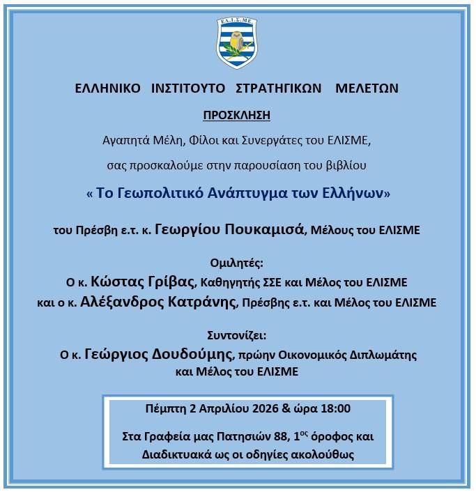Παρουσίαση του βιβλίου με θέμα " Το Γεωπολιτικό Ανάπτυγμα των Ελλήνων " του Πρέσβη ε.τ. κ. Γεωργίου Πουκαμισά, Μέλους του ΕΛΙΣΜΕ