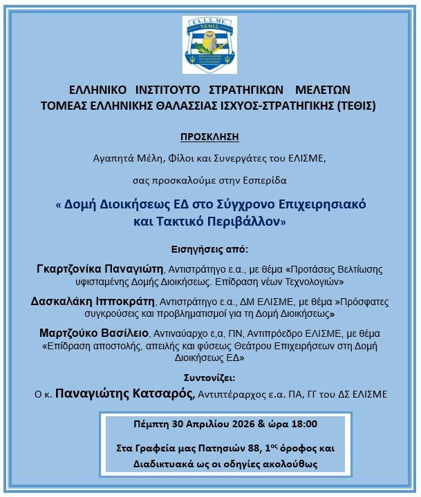 Εσπερίδα ΕΛΙΣΜΕ με θέμα « Δομή Διοικήσεως ΕΔ στο Σύγχρονο Επιχειρησιακό και Τακτικό Περιβάλλον » της Πέμπτης 30 Απριλίου 2026