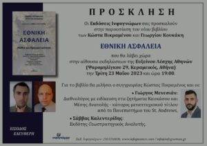 Με αφορμή την έκδοση του πρώτου βιβλίου του Aντισυνταγματάρχη (ΠΖ) Γεώργιου Κουκάκη με τίτλο «Εθνική Ασφάλεια: Μύθοι και Πραγματικότητα», θα ήθελα να σας προσκαλέσω στην παρουσίαση που θα πραγματοποιηθεί την Τρίτη 23 Μαΐου 2023 και ώρα 19:00 στην Εύξεινο Λέσχη στην οδό Ψαρομηλίγκου 29 στον Κεραμεικό .