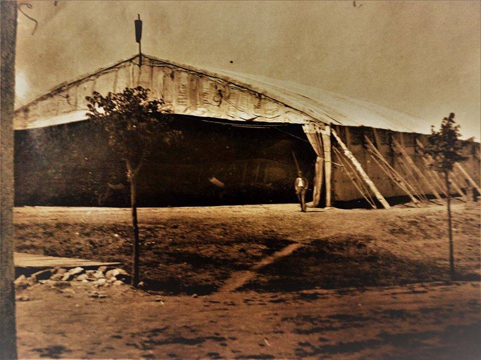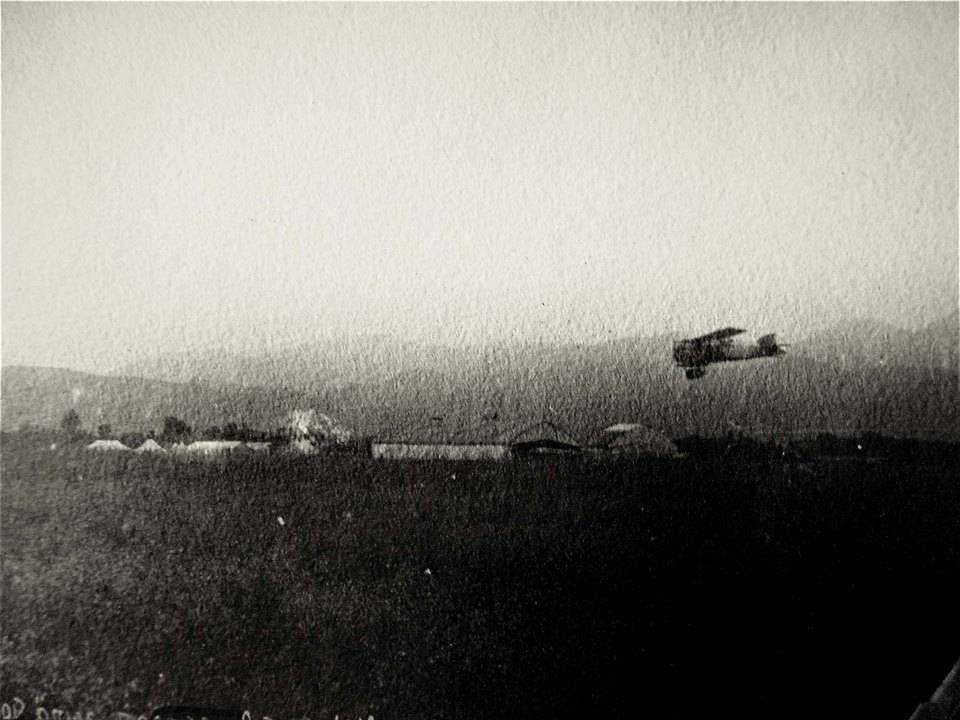 Αεροδρόμιο ΠΡΟΥΣΑΣ (1921). Αεροσκάφος BREGUET 14 επιστρέφοντας από αποστολή στην τελική. Υπόστεγο αερ/φων (λυωμένο) από καραβόπανο (σαν αντίσκηνο)