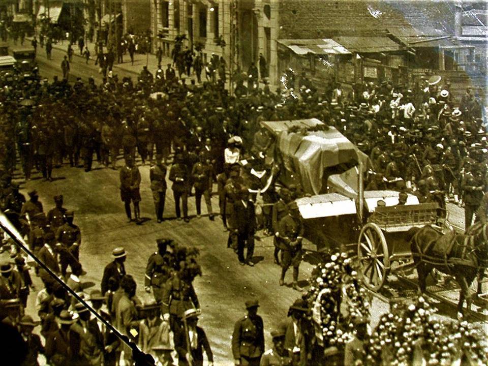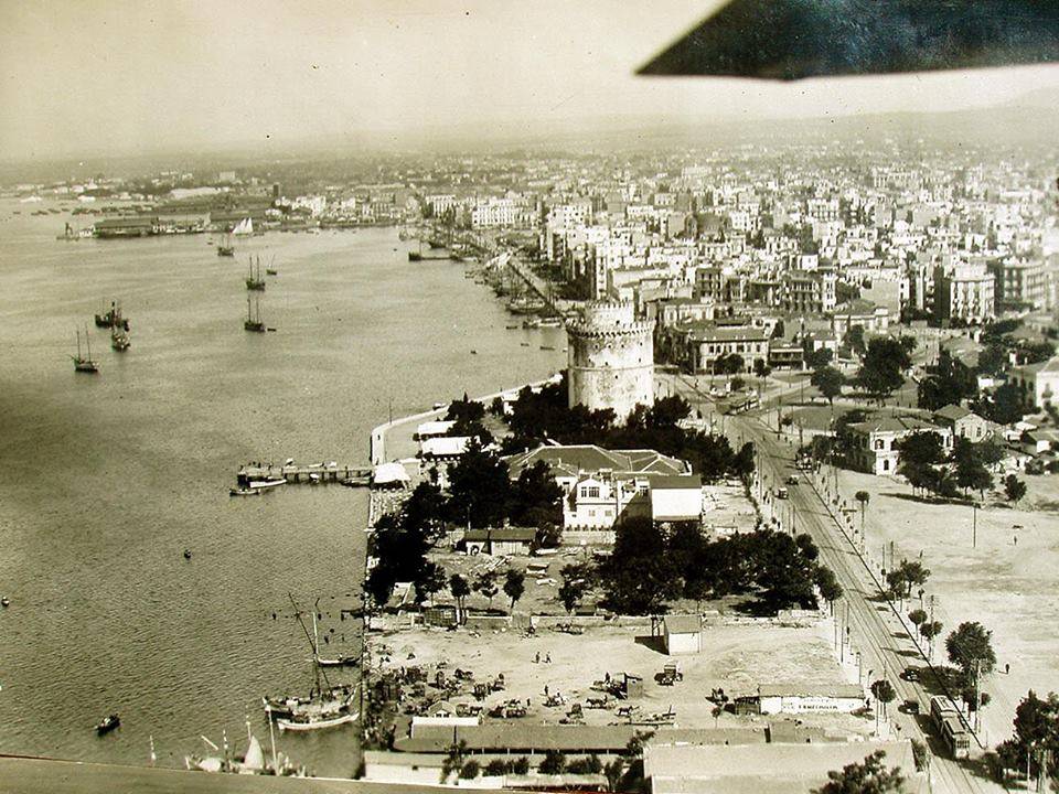 Επειδή τα αεροπορικά ατυχήματα δεν ήταν συχνά όχι λόγω καλύτερης ασφάλειας πτησεων, αλλά λόγω περιορισμένης πτητικής δραστηριότητος οι κηδείες ηταν “μεγαλοπρεπείς”. Εδώ βλέπουμε την κηδεία ενός αεροπόρου πάνω σε κυλίβαντα πυροβόλου να διασχίζει τους δρόμους της Θεσσαλονίκης.