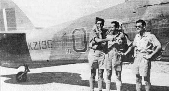 Φωτογραφία από Μέση Ανατολή ( ΣΙΝΤΙ ΜΠΑΡΑΝΙ ). Τρεις χειριστές της 336 Μοίρας Διώξεως μπροστά από Α/ΦΟΣ ΧΑΡΙΚΕΗΝ. Από αριστερά ο Επισμηναγός Β. Βουτσάς, ο Αντισμήναρχος Σ. Ξύδης και ο Επισμηναγός Α. Φραγκιάς