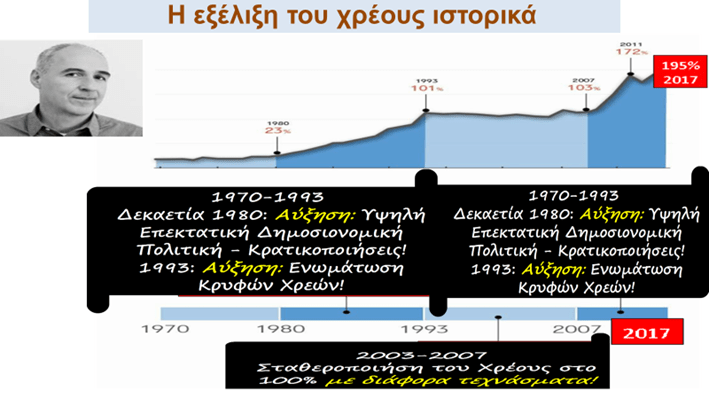 Υπήρξαν δύο σημαντικές αυξήσεις του χρέους που επηρέασαν αρνητικά την πορεία της οικονομικής βελτίωσης και ανάπτυξης στην Ελλάδα τα τελευταία χρόνια.