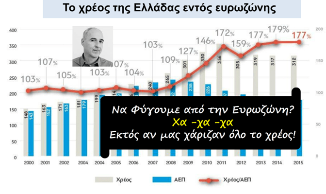 Η Ελλάδα να εγκατέλειπε το € και να γύριζε στη Δραχμή. Αν δεν έπαιρνε μέτρα λιτότητας, ασφαλώς, και θα προσλάμβανε νέους εργαζόμενους, και, θα μείωνε το % ποσοστό της ανεργίας και θα ενίσχυε την ανάπτυξη. Να μετέτρεπε το χρέος από € σε δραχμές, να εκτύπωνε νόμισμα σε δραχμές και να μείωνε την δραχμο-€-ισοτιμία. Αυτό θα μείωνε το κόστος των εξαγωγών και θα τις έκανε ελκυστικότερες, και, ασφαλώς, θα αύξανε τα έσοδα από τον τουρισμό. Μέχρι, εδώ πολύ καλά! Ιδανικό για Ελλάδα.
