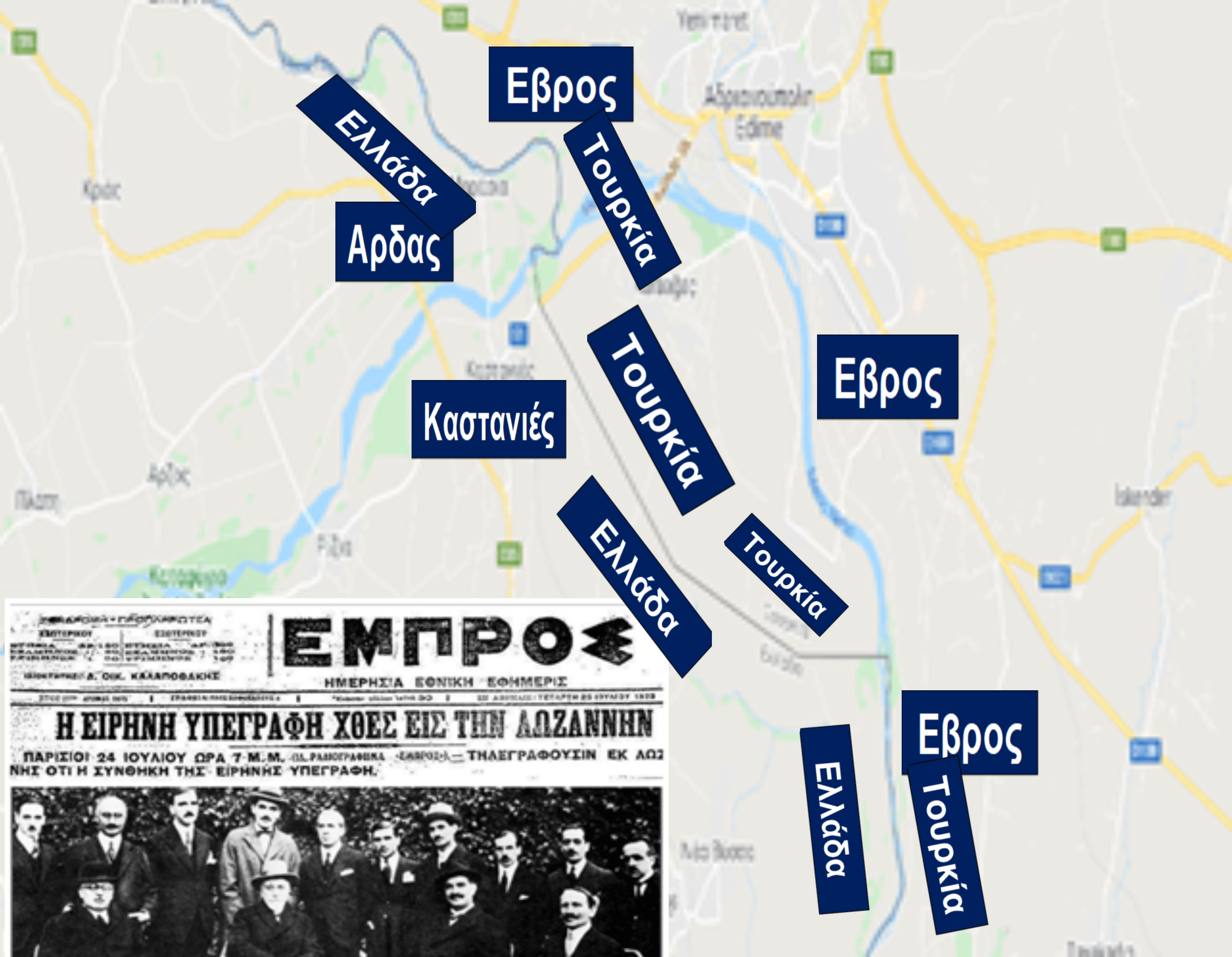 Άρθρον 2. Από του Ευξείνου Πόντου προς το Αιγαίον τα σύνορα της Τουρκίας ορίζονται ως έπεται: (όρα χάρτην υπ’ αριθ. 1, εδώ φαίνεται ένα τμήμα βόρεια στις Καστανιές και ένα νότια στις Φέρες).