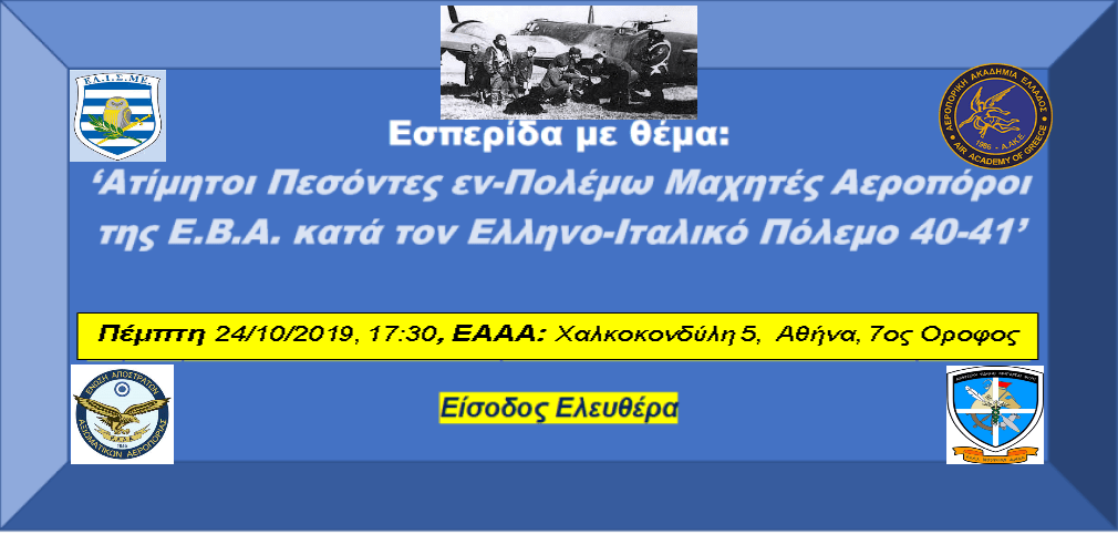 To Ελληνικό Ινστιτούτο Στρατηγικών Μελετών (ΕΛ.Ι.Σ.ΜΕ. www.elisme.gr ), στο πλαίσιο των πολιτιστικών δραστηριοτήτων και προκειμένου να τιμήσει το Ελληνικό Επος του 1940-41, και ιδιαίτερα τους φονευθέντες του έπους, διοργάνωσει, την Πέμπτη 24/10/2019, από 17:30 έως 21:00, Εσπερίδα με θέμα: «Ατίμητοι Φονευθέντες εν Πολέμω Μαχητές Αεροπόροι της Ε.Β.Α. κατά τον Ελληνο-Ιταλικό Πόλεμο 1940-41». Την διοργάνωση συνεπικούρησαν: