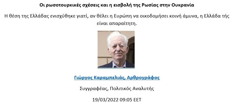 Η “χρήσιμη” Τουρκία και οι μόνιμοι κομπάρσοι: “Βρέχει” εξελίξεις στην περιοχή και στην Αθήνα και τη Λευκωσία κρατούν… ομπρέλες Του ΝΙΚΟΥ ΜΕΛΕΤΗ, Liberal Λίγο πριν συμπληρωθούν δυο μήνες από τη στιγμή που ο πρόεδρος Πούτιν έδωσε το σύνθημα για την εισβολή των ρωσικών δυνάμεων στην Ουκρανία, το ερώτημα που βασανίζει ηγεσίες και λαούς κυρίως στη Δύση είναι το πότε […]