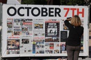 FILE PHOTO A women looks at Israeli newspapers headlines reporting the October 7th attacks in ‘the hostages square’ outside the Kirya military base, in Tel Aviv, Israel, 06 December 2024. EPA/ABIR SULTAN