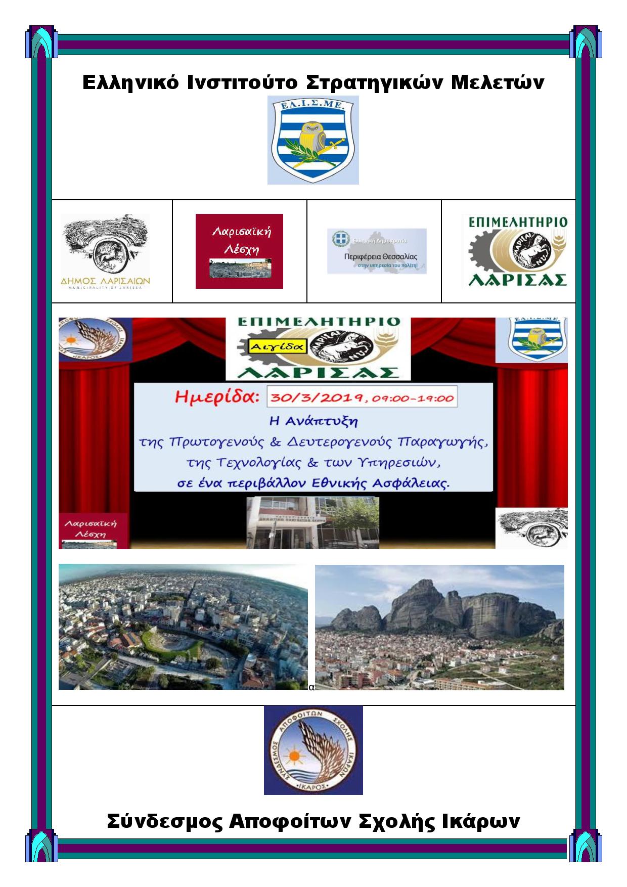 Ετσι, συνεχίσαμε και συνδιοργανώσαμε, στη Λάρισα, την 30/03/2019, με τη φιλοξενία του Δήμου Λαρισαίων, υπό την Αιγίδα του Επιμελητηρίου της Λάρισας και τη στήριξη της Λαρισαϊκής Λέσχης την Ημερίδα ‘Η Ανάπτυξη της Πρωτογενούς και Δευτερογενούς Παραγωγής, της Τεχνολογίας & των Υπηρεσιών, σε ένα Περιβάλλον Εθνικής Ασφάλειας.’ κλείνοντας τη δράση του θέματος με εξαιρετική επιτυχία, επαγγελματισμό και τεκμηρίωση ( η οποία θα αναρτηθεί και διατεθεί στο διαδίκτυο τις επόμενες μέρες) δημιουργώντας ένα ‘Defence Reference Point’.