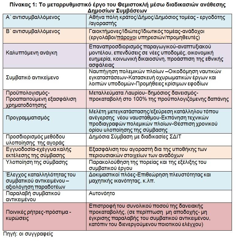 Στο σημείο αυτό θεωρείται σημαντικό να αναφερθεί ότι το πλαίσιο των προβλέψεων της ανωτέρω σύμβασης ταυτίζεται σχεδόν απόλυτα με τις κανονιστικές διαδικασίες υλοποίησης των σύγχρονων προγραμμάτων ΣΔΙΤ – τα οποία εντάσσονται στο ευρύτερο πεδίο των Δημοσίων Συμβάσεων – σύμφωνα με τα διαλαμβανόμενα στον Πίνακα 2, στοιχείο που τεκμηριώνει την πνευματική οξυδέρκεια του Θεμιστοκλή και σε θέματα δημοσιονομικής πολιτικής. Ωσαύτως, επιβεβαιώνει ότι επιχειρησιακά εργαλεία, τεχνικές, μεθοδολογίες και αναπτυξιακά μοντέλα που χρησιμοποιούνται στη σύγχρονη εποχή, εδράζονται στη κλασσική Ελλάδα και αποτελούν κοινό κτήμα της παγκόσμιας κληρονομιάς.