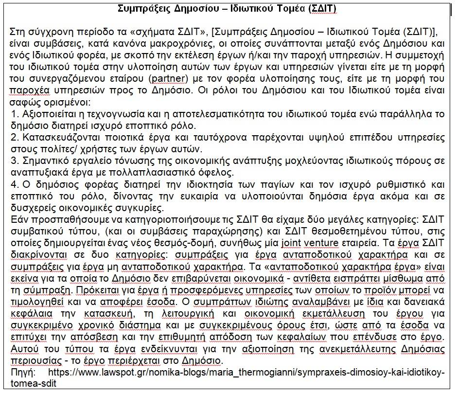 Στη συμφωνία αυτή οι Ρωμαίοι νομικοί, διαβλέπουν αργότερα σύμβαση «αγοραπωλησίας μέλλοντος πράγματος» (Μαριδάκης, 1963). Άλλωστε, η ανωτέρω περιγραφείσα συμφωνία Δήμου-ιδιωτών, διαθέτει όλα τα χαρακτηριστικά του προγραμματισμού, υλοποίησης και παρακολούθησης της σύγχρονης διοικητικής σύμβασης αγοραπωλησίας αγαθών, υπηρεσιών μελετών-έργων και εν προκειμένω μίας Δημόσιας Σύμβασης, όπως περιγράφεται στον Πίνακα 1.