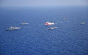 Το «Ορούτς Ρέις» συνοδευόμενο από τουρκικά πολεμικά πλοία πλέει στα ανοιχτά της Αττάλειας. Το να επιτραπεί στην Τουρκία από τους Ευρωπαίους διπλωμάτες να αμφισβητεί την ΑΟΖ της Ελλάδας ή της Κύπρου σημαίνει ότι ενθαρρύνεται η επεμβατικότητά της σε όλη την Ανατολική Μεσόγειο. Φωτ. REUTERS