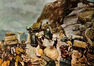 Πριν ξημερώσει ξεκινούν: Γυναίκες, κορίτσια, αγόρια, γριές και γέροι, φορτωμένοι αυτοί και τα γαϊδουράκια τους, με τρόφιμα και μια κουβέρτα ο καθένας. Βαδίζουν με τη συνοδεία και του υπομοιράρχου Σιαπέρα και των ανδρών του…