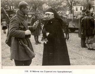 Και για μια άλλη γριά, που της είχε γκρεμιστεί κι αυτηνής το μουλάρι. (Άλλο συμπαθητικό θύμα του πολέμου κι αυτό…) . Ας γκρεμίστηκε, έλεγε. Κουρμπάνι το κάνω. Το γιό μου να φυλάει ο θεός. Αυτόν να δω να γυρίζει, πούναι στρατιώτης. (Γράφει γι’ αυτήν δ Κώστας Λαζαρίδης, που την είδε κι ο ίδιος) ….