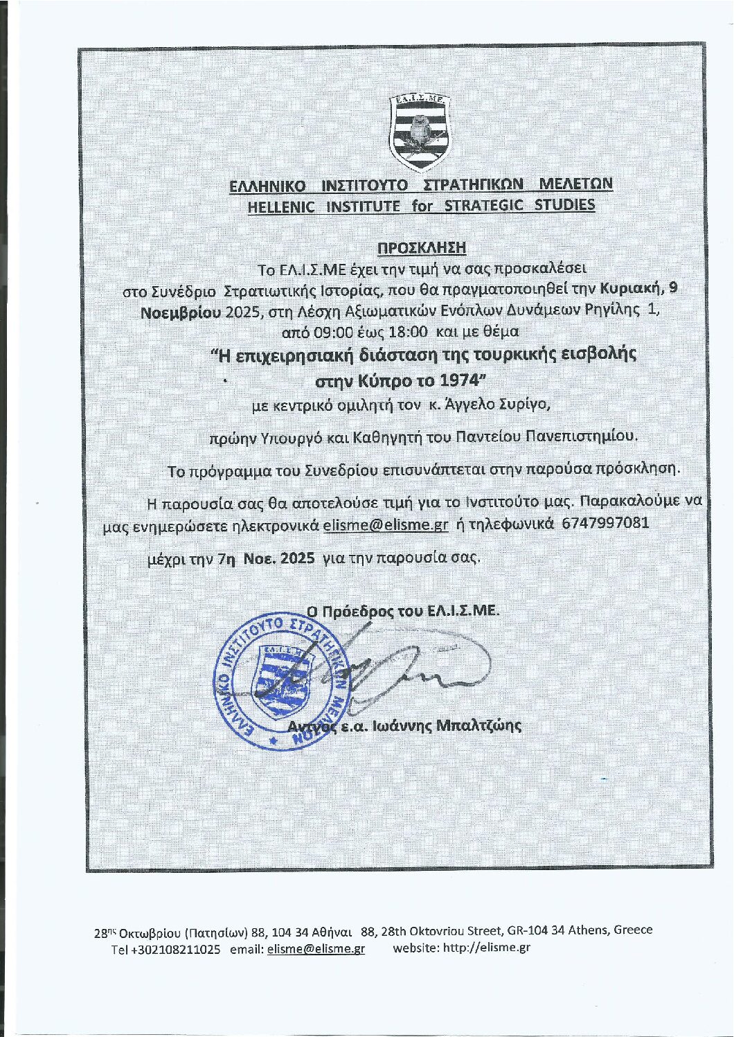 Με αφορμή τη συμπλήρωση πενήντα ετών από την τουρκική εισβολή στην Κύπρο, το Ελληνικό Ινστιτούτο Στρατηγικών Μελετών (ΕΛΙΣΜΕ) διοργανώνει Συνέδριο Στρατιωτικής Ιστορίας με θέμα: