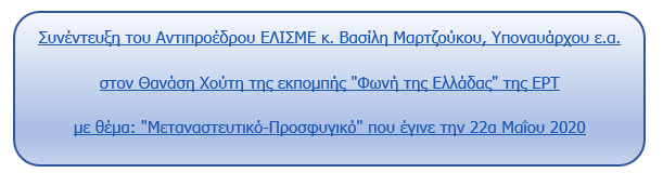 Συνέντευξη Β.Μαρτζούκου για το Μεταναστευτικό της 22 Μαϊου 2020 Super User 27 Μαΐου 2020 Ομιλίες 0 Πατήστε οπουδήποτε μέσα στο γαλάζιο πλαίσιο για να ακούσετε τη συνέντευξη: Κοινοποιήστε: Πατήστε για κοινοποίηση στο Facebook(Ανοίγει σε νέο παράθυρο) Facebook Click to share on X(Ανοίγει σε νέο παράθυρο) X Κλικ για κοινοποίηση στο LinkedIn(Ανοίγει σε νέο παράθυρο) LinkedIn Πατήστε για να μοιραστείτε στο WhatsApp(Ανοίγει σε νέο παράθυρο) WhatsApp Πατήστε για να μοιραστείτε στο Telegram(Ανοίγει σε νέο παράθυρο) Telegram Κλικ για εκτύπωση(Ανοίγει σε νέο παράθυρο) Εκτύπωση Κλικ για αποστολή ενός συνδέσμου μέσω email σε έναν/μία φίλο/η(Ανοίγει σε νέο παράθυρο) Email