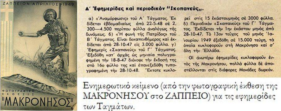 - Αρχειακά Τεκμήρια & Φωτογραφική έκθεσις Μακρονήσου, Απρίλιος 1949, των Ειδικών Στρατιωτικών Ταγμάτων Οπλιτών της Μακρονήσου, έντυπα μέσα από τα οποία αναδεικνύεται η αποστολή της Εθνικής Διαφωτίσεως των οπλιτών στην Μακρόνησο και διαψεύδονται οι κομμουνιστικοί ισχυρισμοί περί βασανισμών από Αξιωματικούς ή οπλίτες των Ταγμάτων.]