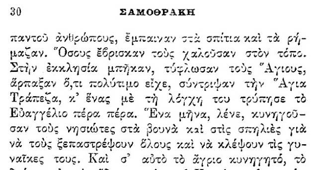 Όμως 1η Σεπτεμβρίου 1821 των λεγόμενη στο τοπικό ιδίωμα «πρωτοσταυρινιά» αποβιβάστηκαν στη Σαμοθράκη τα αγήματα των Τούρκων υπό τον υποναύαρχο Καρά-Αλή (σ.σ. είναι αυτό που αργότερα τον Ιούνιο του 1822, ανατίναξε μαζί με την ναυαρχίδα του, ο πυρπολητής Κωνσταντίνος Κανάρης). Αμέσως άρχισαν το έργο της σφαγής και των λεηλασιών. Σφαγιάσθηκαν μερικές χιλιάδες άνδρες και αγόρια. Τα γυναικόπαιδα πουλήθηκαν στα παζάρια σκλάβων της Κωνσταντινούπολης και της Σμύρνης. Τα σπίτια τους κάηκαν. Το νησί ερημώθηκε.