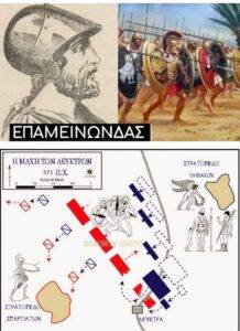 Ο στρατηγός των Θηβαίων Επαμεινώνδας εφάρμοσε για πρώτη φορά στην ιστορία των μέχρι τότε πολέμων μια νέα στρατιωτική τακτική εναντίον των Σπαρτιατών στην Μάχη των Λεύκτρων, το 371 π.Χ η οποία και τον ανέδειξε σε έναν από τους ευφυέστερους στρατηγούς όλων των εποχών.
