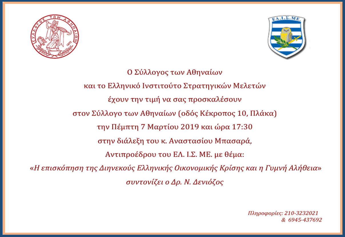 Αναστάσιος Μπασαράς: Πρόσκληση Διάλεξης ‘Η Επισκόπηση της Διηνεκούς Ελληνικής Οικονομικής Κρίσης & η Γυμνή Αλήθεια! ‘